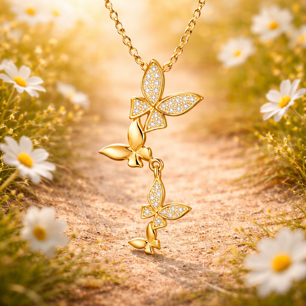 Et nydelig halskjede som symboliserer frihet, forandring og skjønnhet. De delikate sommerfuglene, utsmykket med glitrende cubic zirconia-steiner, skaper et lekent og elegant uttrykk som passer perfekt til enhver anledning – både til hverdags og fest.