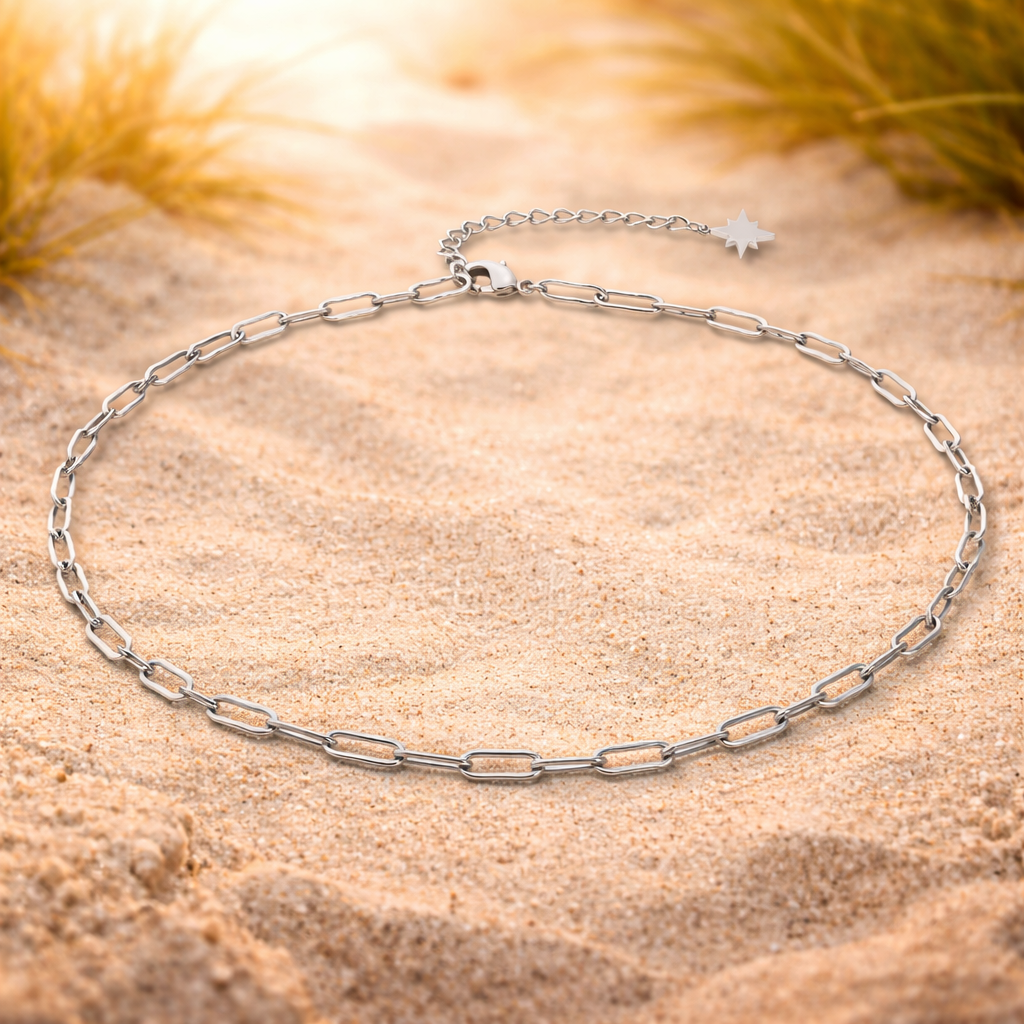 Et elegant og moderne halskjede med rene linjer og klassiske lenker. Det enkle designet gjør det perfekt å bruke alene for et minimalistisk uttrykk, eller i kombinasjon med andre smykker for en trendy lag-på-lag stil.