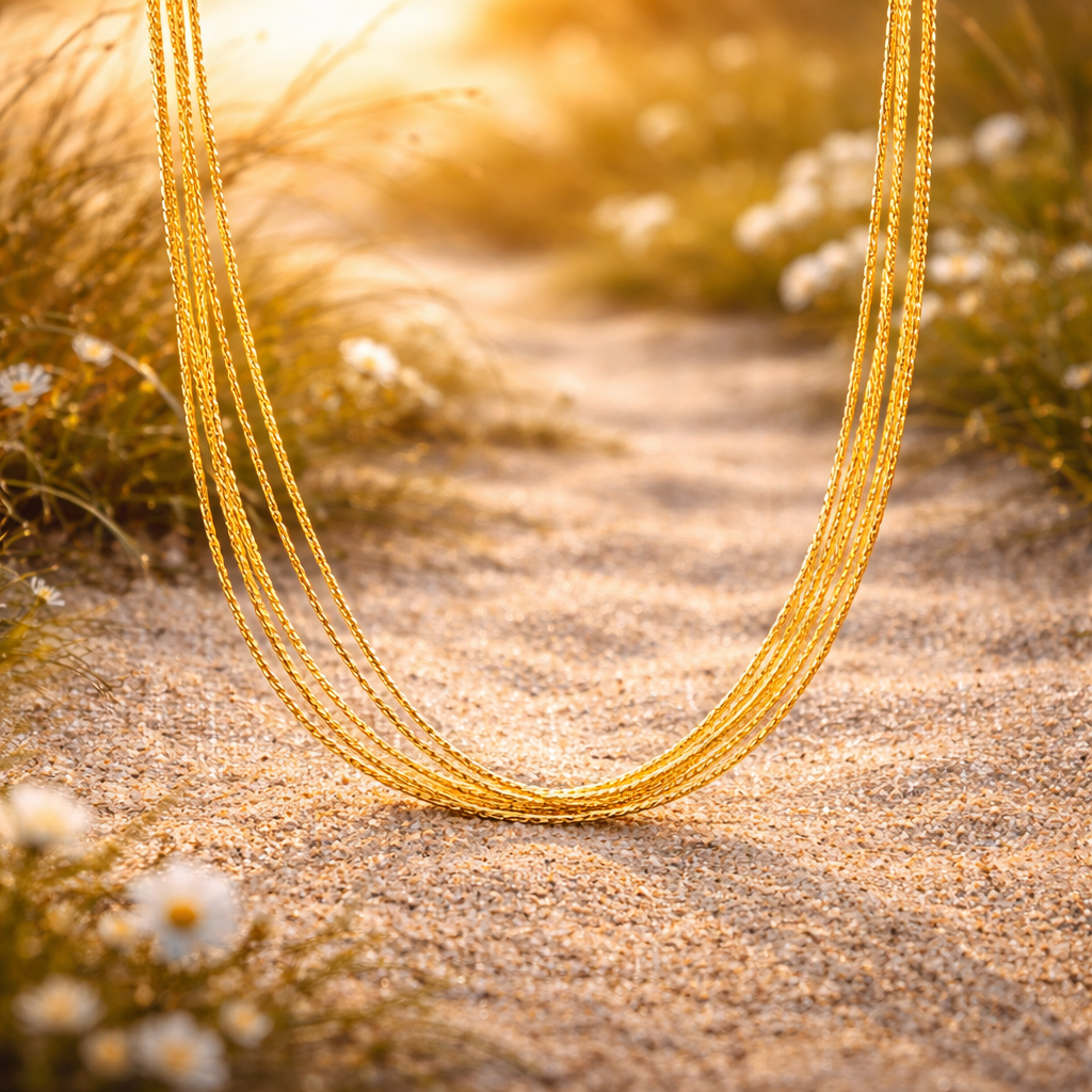 En hyllest til enkelhet og eleganse – Gyllent Halskjede er laget av 18K gullbelagt rustfritt stål, som gir en varig glød og et luksuriøst uttrykk. De fine lenkene legger seg mykt mot huden og skaper et harmonisk spill av lys, som minner om solstråler som danser over sanden.
