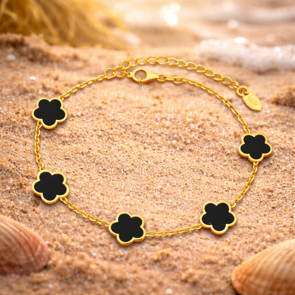 Blomstereng Armbånd gir et feminint og sofistikert uttrykk med sine små blomster i gyllent stål og svart kontrast. Et perfekt tilbehør som løfter ethvert antrekk – både til hverdags og spesielle anledninger.