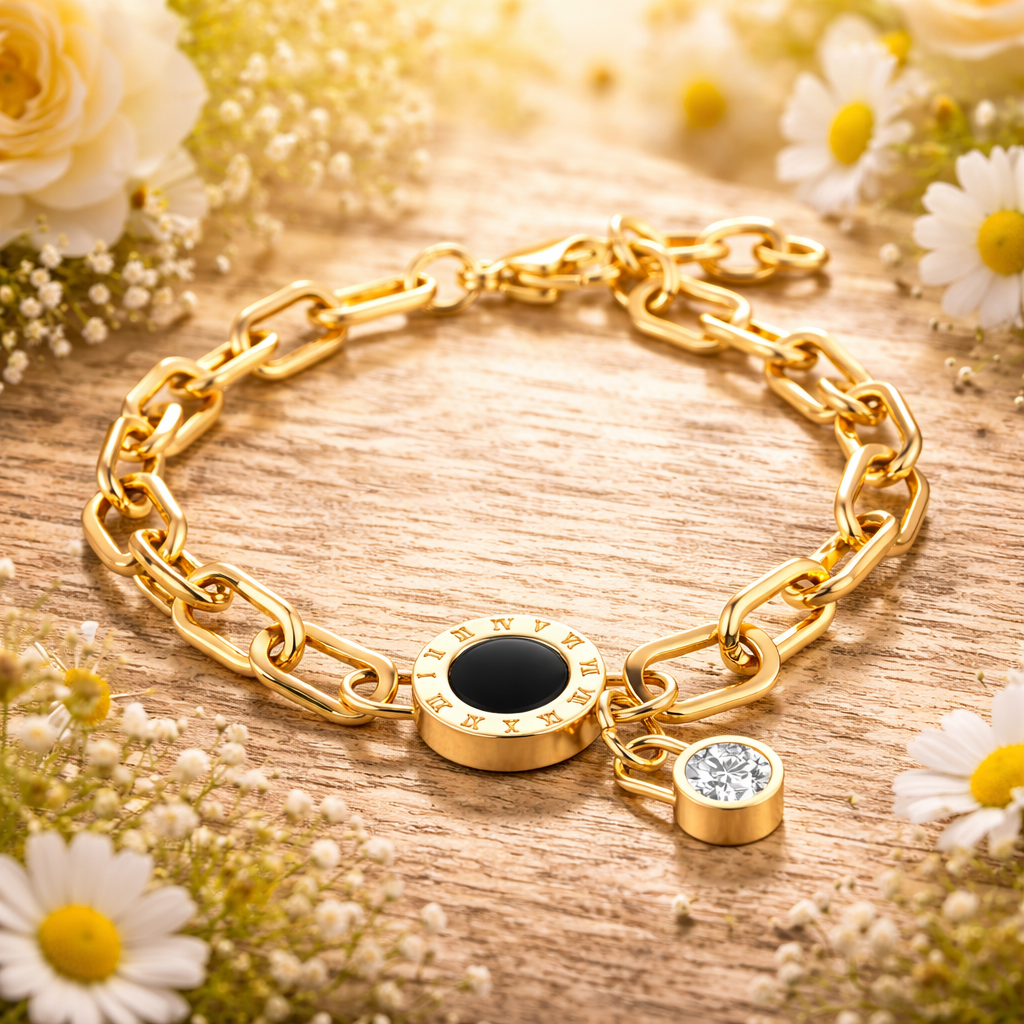Inspirert av klassisk skjønnhet og moderne styrke – Roma Armbånd kombinerer delikate detaljer med et kraftfullt uttrykk. Den glatte lenken i 18K gullbelagt rustfritt stål prydes av et rundt anheng med romerske tall og en glitrende cubic zirconia-stein som fanger lyset med hvert eneste bevegelig øyeblikk.