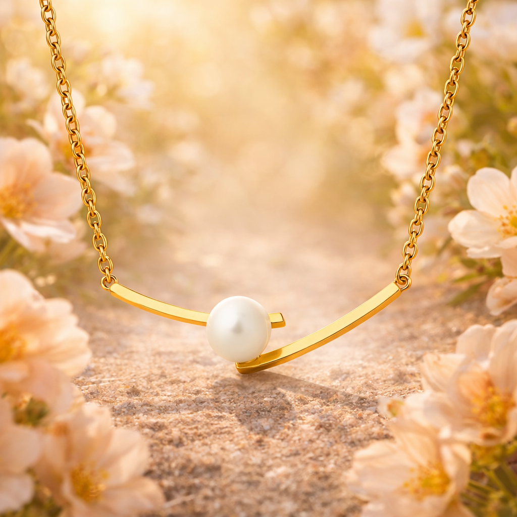 Dette perlehalskjedet kombinerer klassisk skjønnhet med et moderne design. Den delikate imiterte perlen balanserer perfekt i en elegant gullbue, og gir et raffinert uttrykk som passer både til hverdags og spesielle anledninger.
