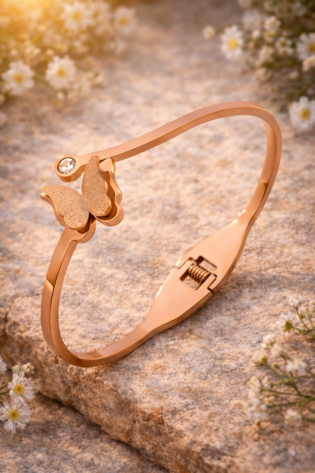 Et feminint og lekent armbånd med en vakker sommerfugl som hoveddetalj, kombinert med en glitrende cubic zirconia-sten for et subtilt skinn. Den varme gyldne tonen og den myke, organiske formen gjør smykket perfekt både til hverdags og som et lite blikkfang til antrekket. Armbåndet åpnes enkelt med en fjærbelastet mekanisme som gir god komfort og sikker passform.
