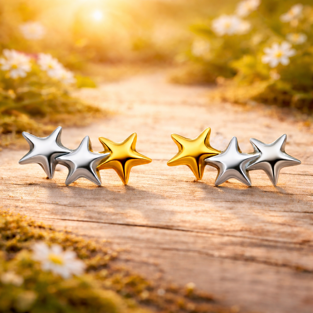 Disse stjerneøredobbene i 18K gullbelagt stål kombinerer moderne stil med tidløs glans. Den unike blandingen av gull- og sølvfarget metall gir et lekent, men elegant uttrykk – perfekt for deg som liker subtil luksus.