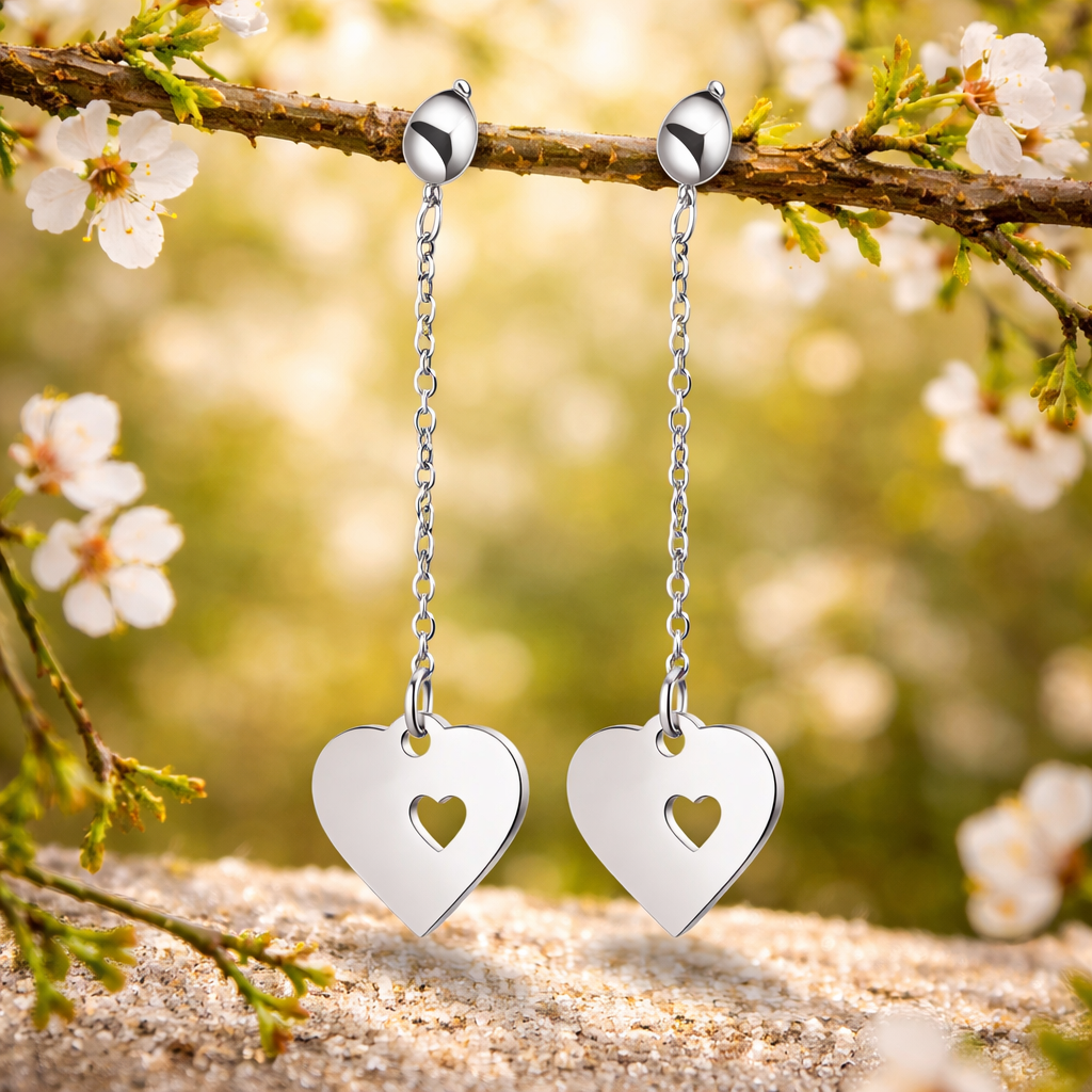 Disse Hjerte Øredobbene i rustfritt stål kombinerer enkelhet og romantikk på en nydelig måte. De hengende hjertene med et lite utskåret detaljhjerte gir et delikat og feminint uttrykk som passer perfekt til både hverdags og fest.