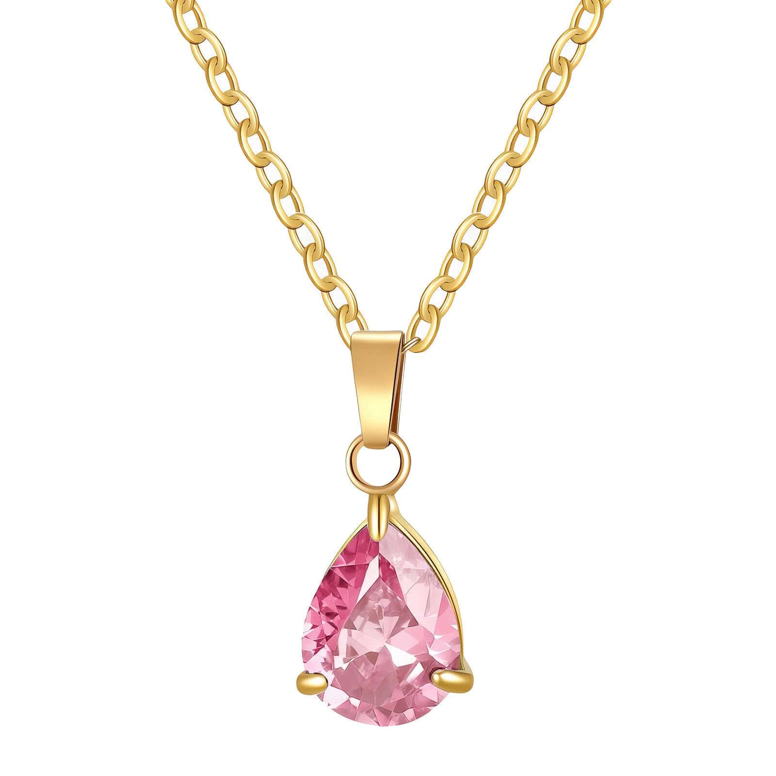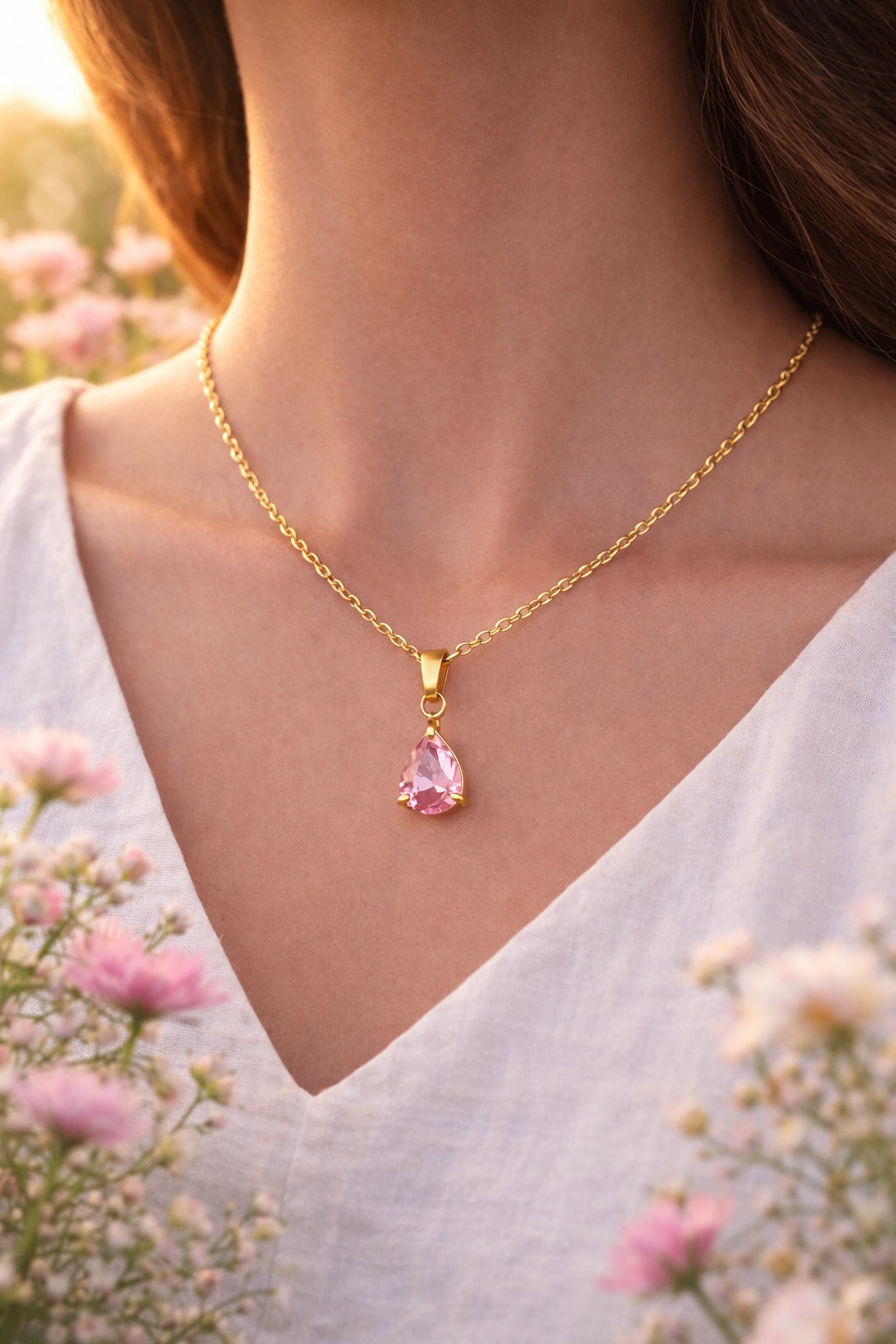 Dette nydelige dråpehalskjedet er et elegant og tidløst smykke som kombinerer en delikat rosa cubic zirconia-stein med et klassisk anheng i 18K gullbelagt stål. Den klare, fasettslipte steinen gir smykket et romantisk og luksuriøst uttrykk, perfekt både til hverdags og fest.